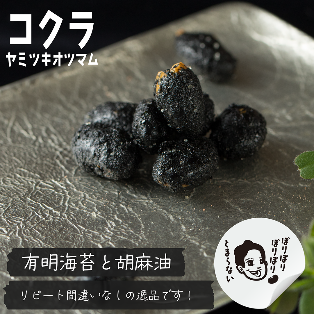 福岡小倉みやげで大人気のコクラヤミツキオツマムは、上質なタンパク質の宝庫、国産の黒大豆のやみつき豆菓子。