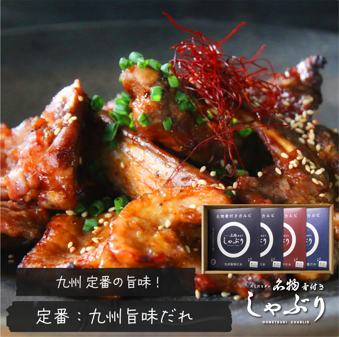 福岡名物グルメ「骨付きカルビ」の詰め合わせセット。スタンダードの「九州旨味だれ」、ピリ辛の「ピリッと旨辛だれ」、九州ねぎの食感と香ばしい胡麻の香りが効いた塩味「やみつきねぎ塩だれ」の3種のおいしさを食べ比べ。
