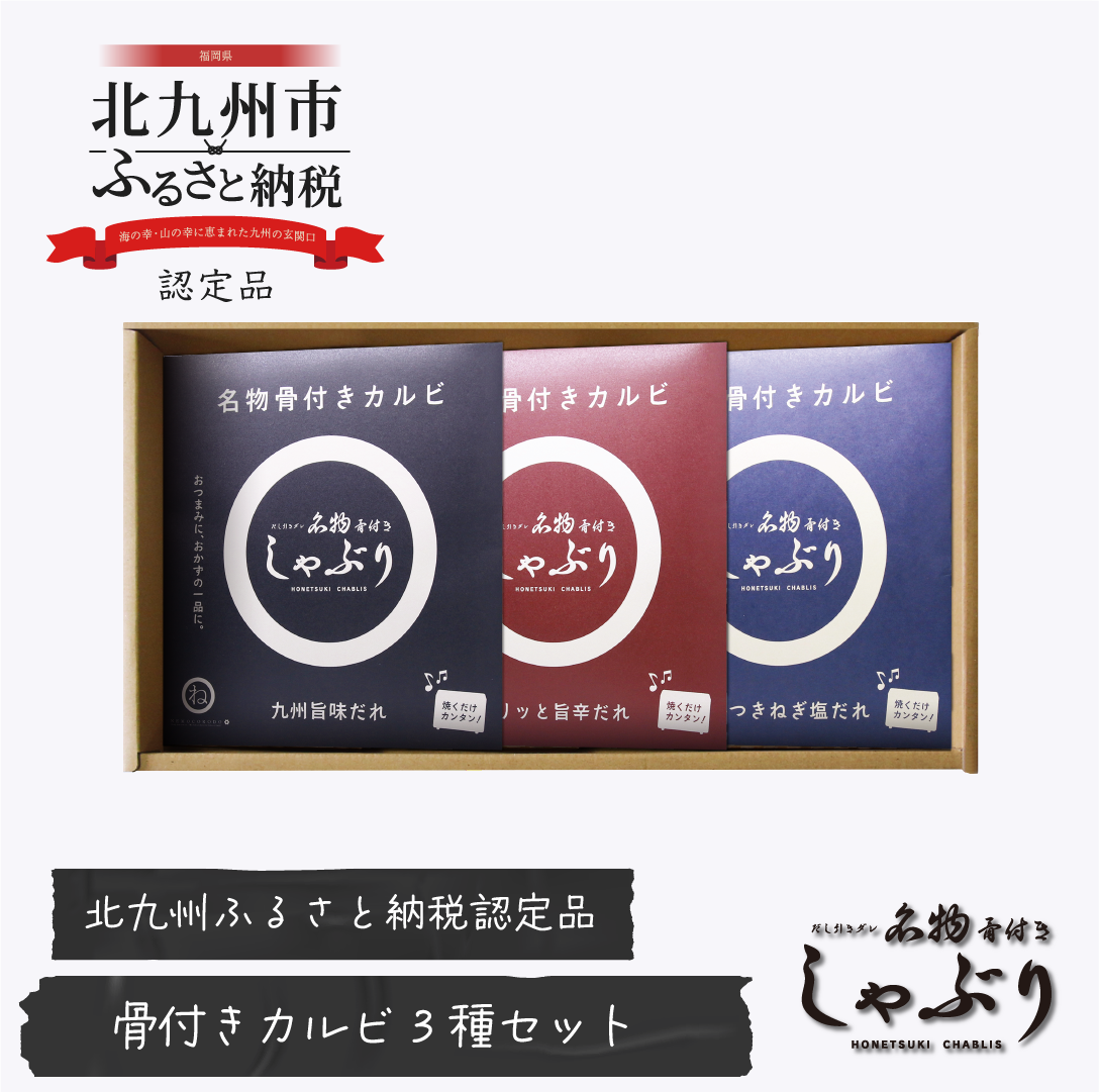 福岡名物グルメ「骨付きカルビ」を詰め合わせ。人気のスタンダード「九州旨味だれ」、大人のピリ辛味「ピリッと旨辛だれ」、九州ねぎの食感と香ばしい胡麻の香りが効いた塩味「やみつきねぎ塩だれ」の3種のおいしさを楽しめる「骨付きしゃぶり」人気の定番セット。